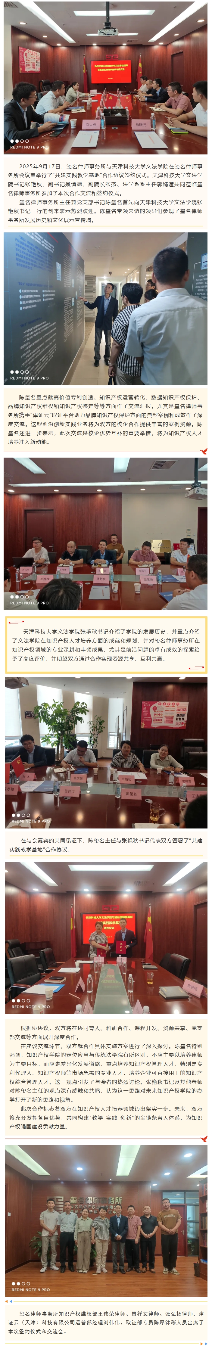 2025年9月17日,天津科技大学文法学院与玺名律师事务所在玺名律师事务所举行“共建实践教学基地”合作协议签约仪式。天津科技大学文法学院张艳秋书记、副书记聂慎德、副院长张杰、法学系系主任郭婧滢共同莅临玺名律师事务所参加了本次合作交流和签约仪式。