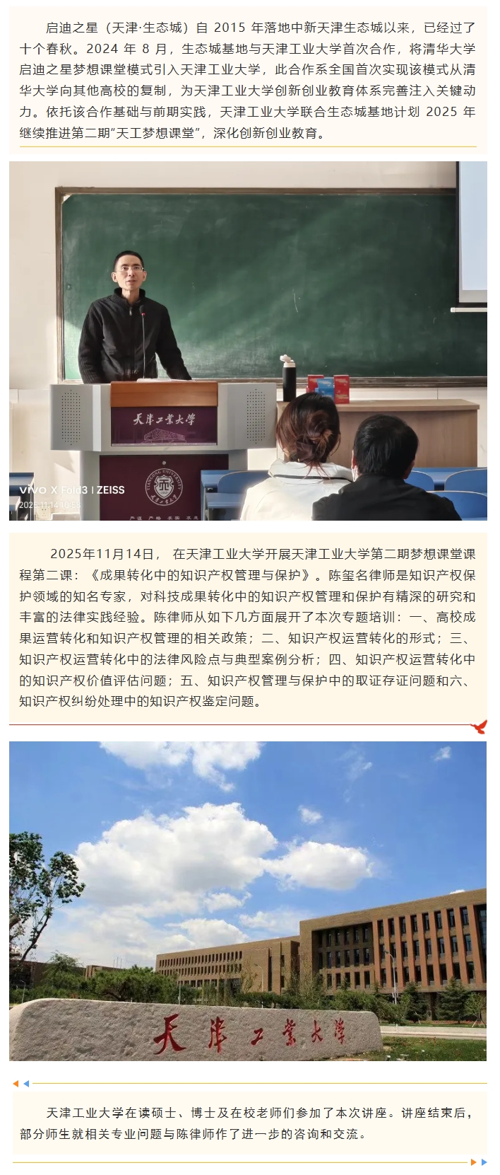 启迪之星(天津·生态城)自 2015 年落地中新天津生态城以来,已经过了十个春秋。 2024 年 8 月,生态城基地与天津工业大学首次合作,将清华大学启迪之星梦想课堂模式引入天津工业大学,此合作系全国首次实现该模式从清华大学向其他高校的复制,为天津工业大学创新创业教育体系完善注入关键动力。依托该合作基础与前期实践,天津工业大学联合生态城基地计划 2025 年继续推进第二期“天工梦想课堂”,深化创新创业教育。